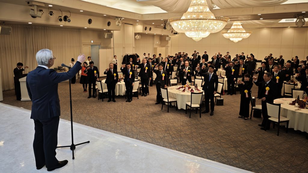 【写真】乾杯の発声をする当会名誉会長の櫻井裕さん(左手前)=今月16日18時15分ごろ前橋市のロイヤルチェスター前橋で浅野勇貴撮影=
